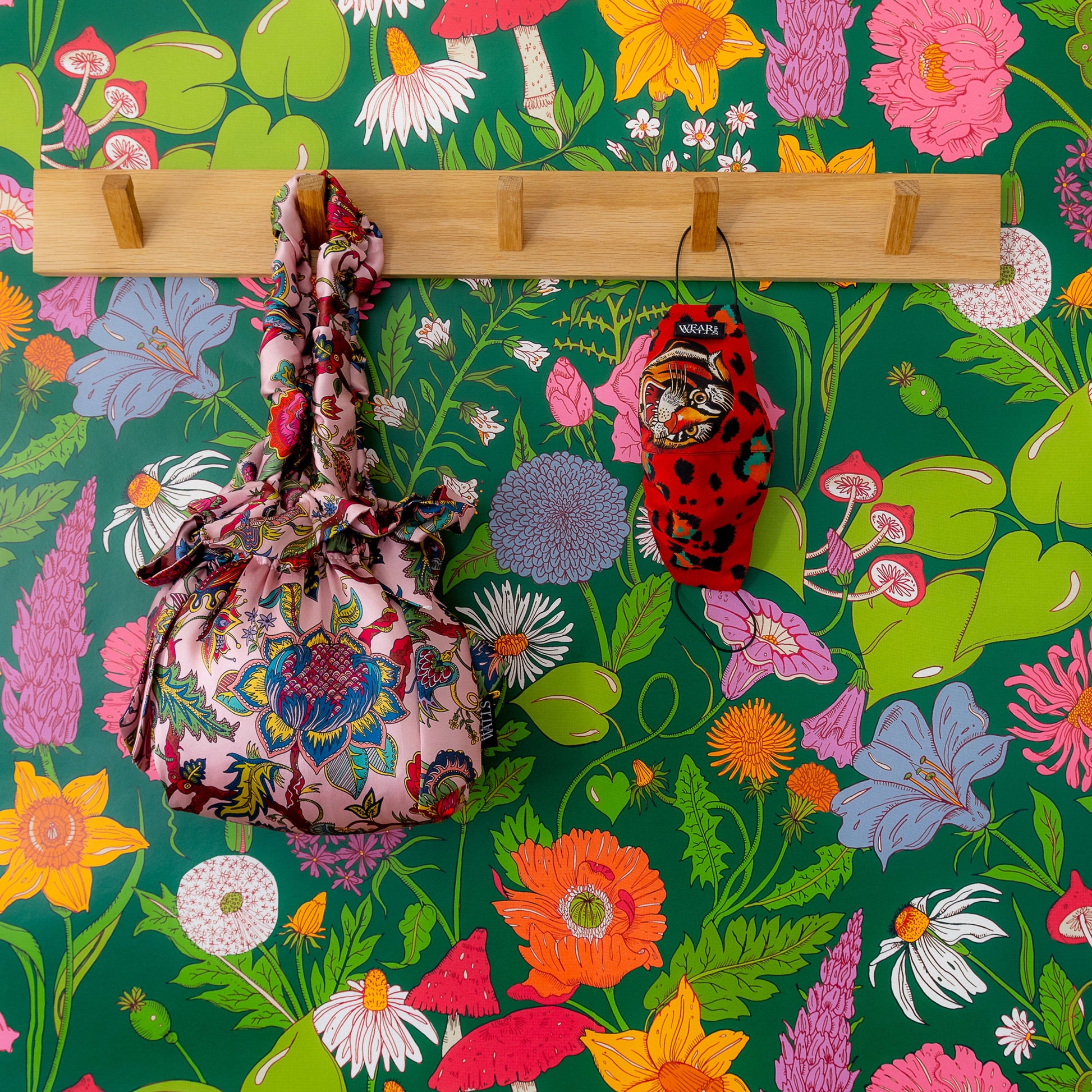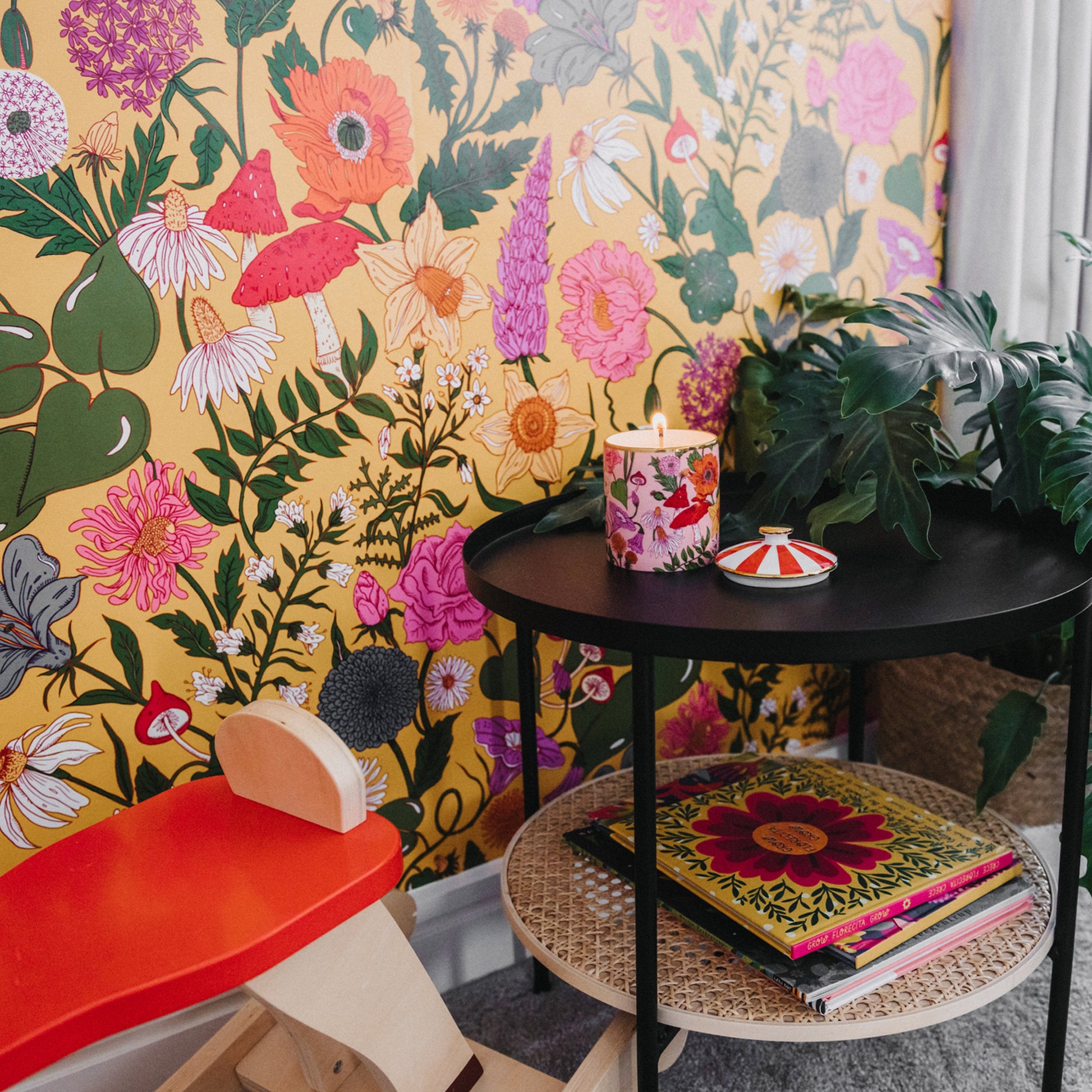 Bloom, a flower especially cultivated for its beauty. This illustrative design features an entanglement of oversized fresh wildflowers, reminiscent of childhood story books. Bloom features peonies, roses and daisies and has an inkling of enchantment and wonder.