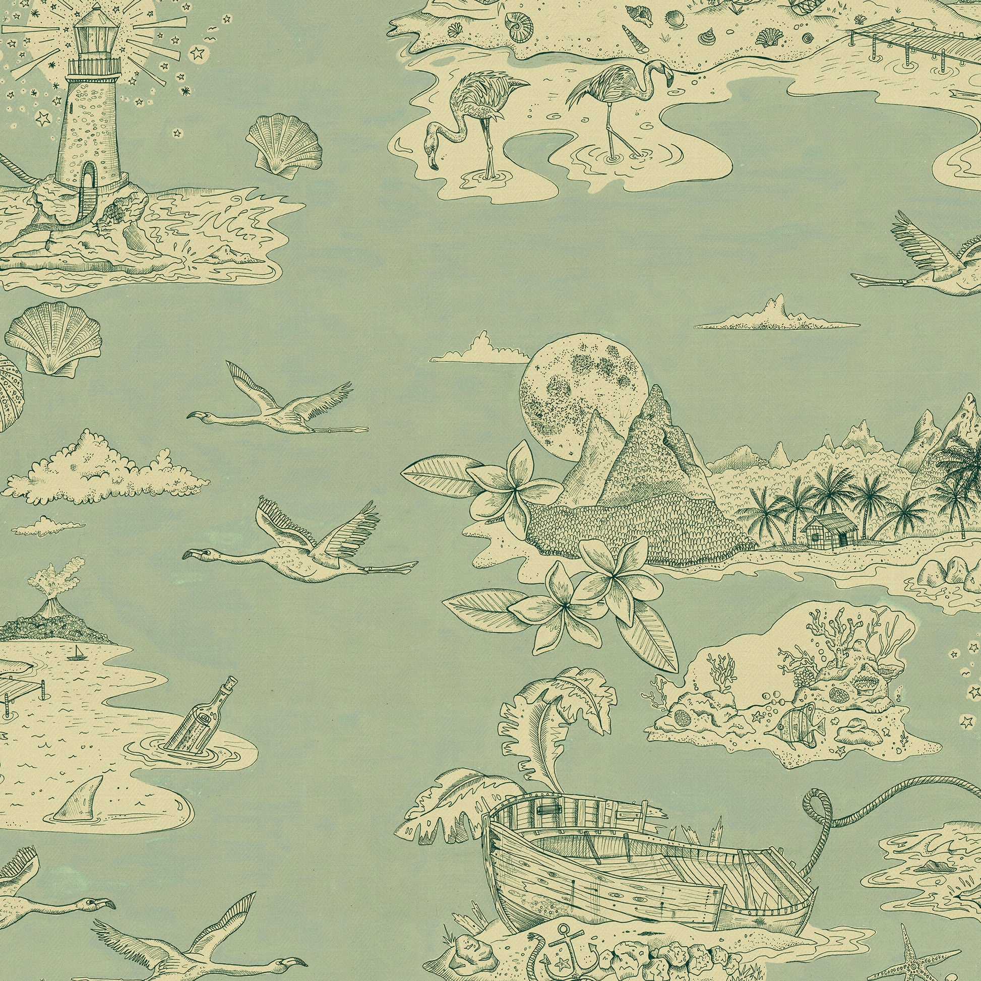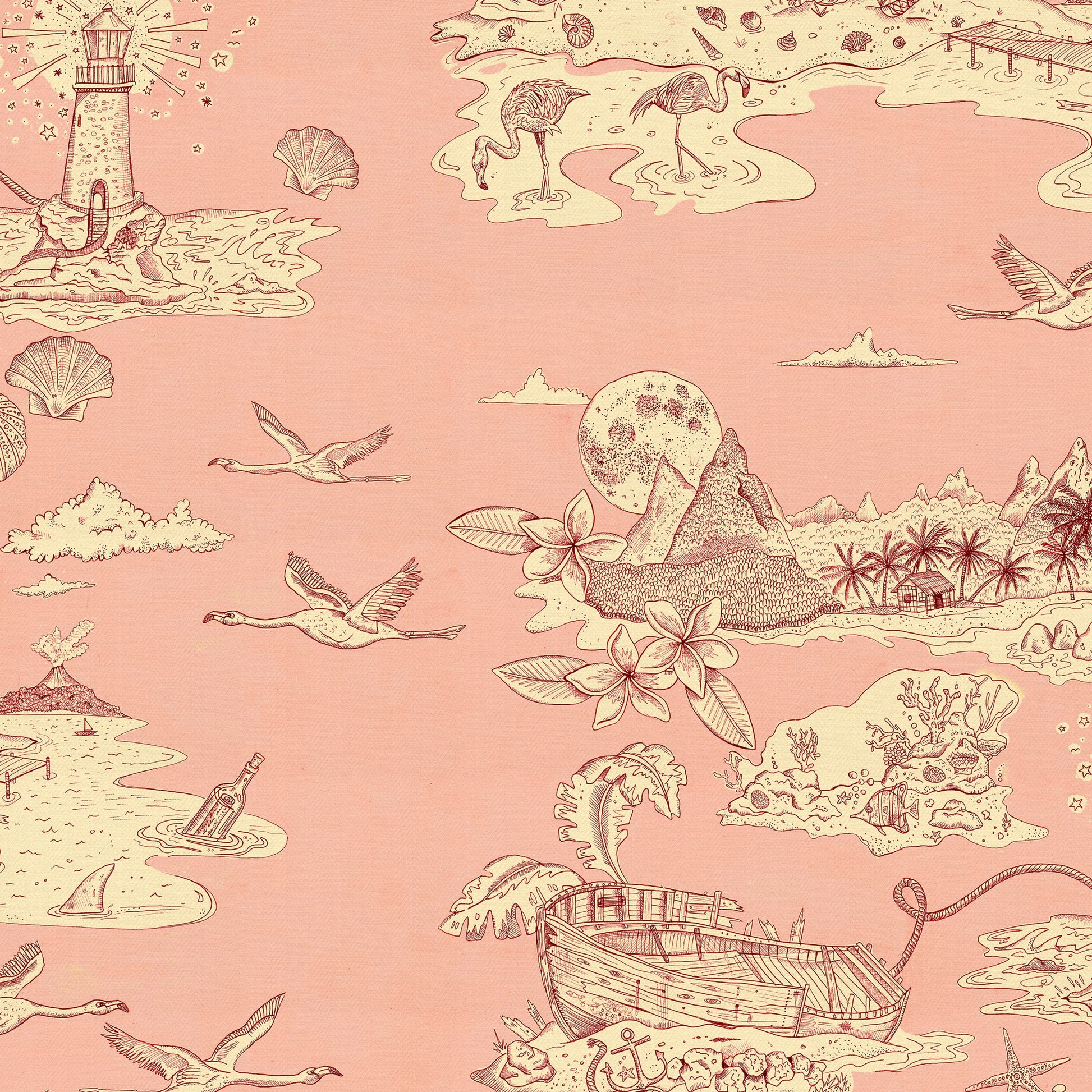 Castaway is our modern take on a traditional 'Toile de joy' style print. Featuring a 'lost in paradise' landscape which includes mountains, flying flamingos, palm trees, ship wrecks and a lighthouse. Castaway was designed with a back-to-nature island way of life in mind and was hand drawn using fine liners. We have added a texture to age the print and give it a more tactile feel. We wanted to create a paired back mono-tone design for an understated wallpaper effect in contrast to all our busy colourful designs!