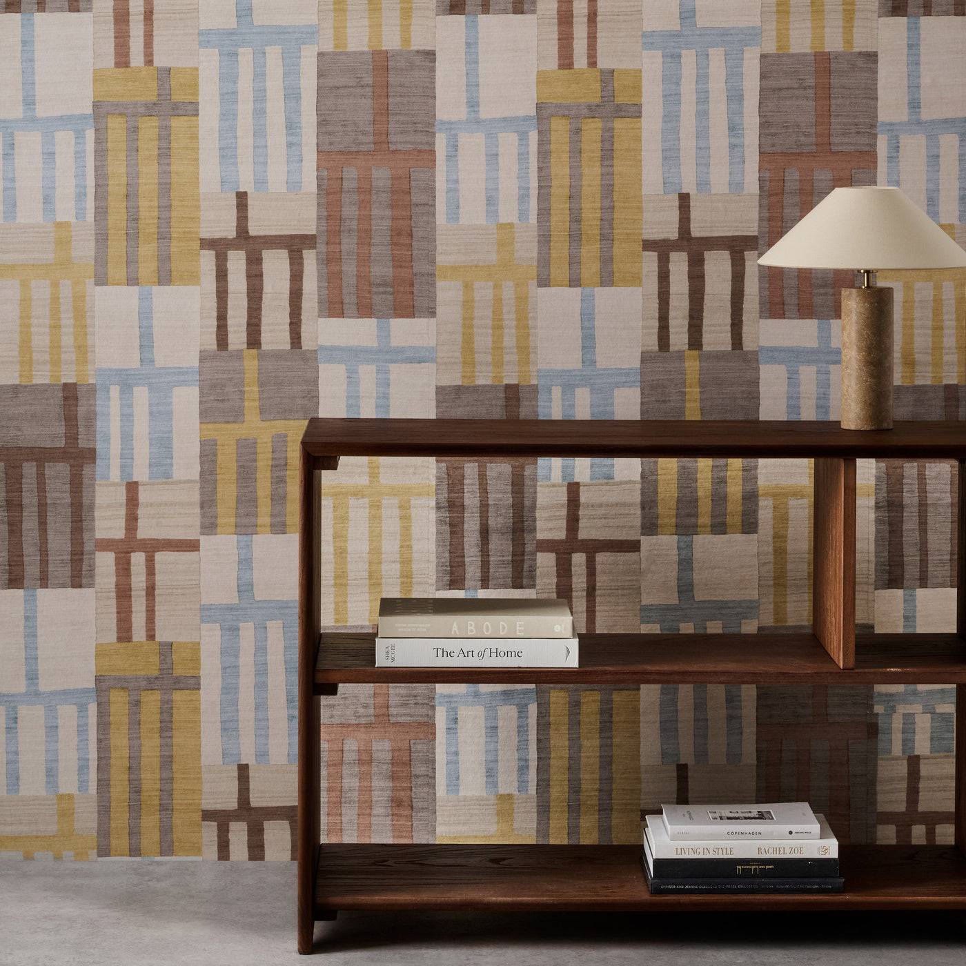 Grids of lines create blocks of colour, drawn with a loose textile feel, in toning colours. Wide width product.
