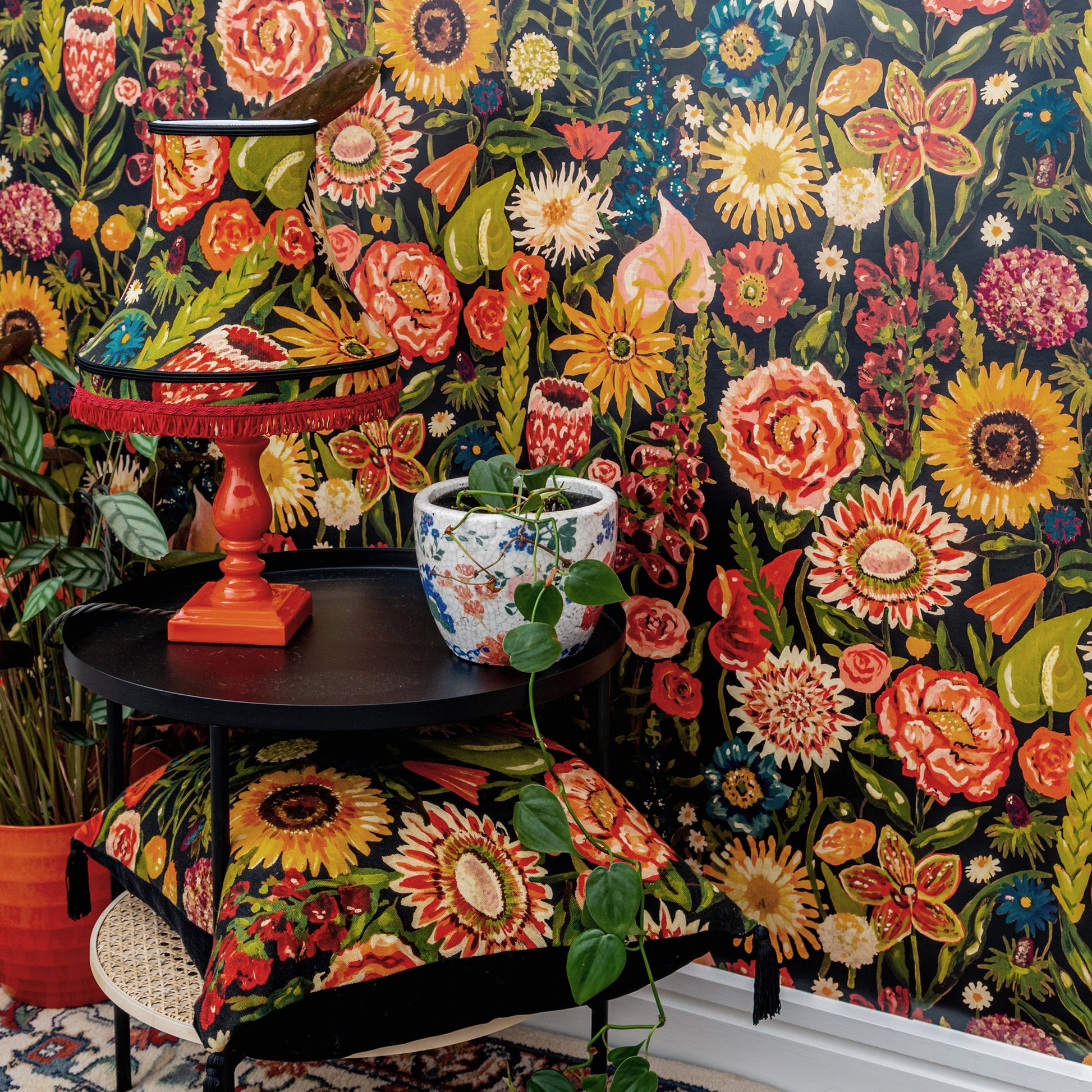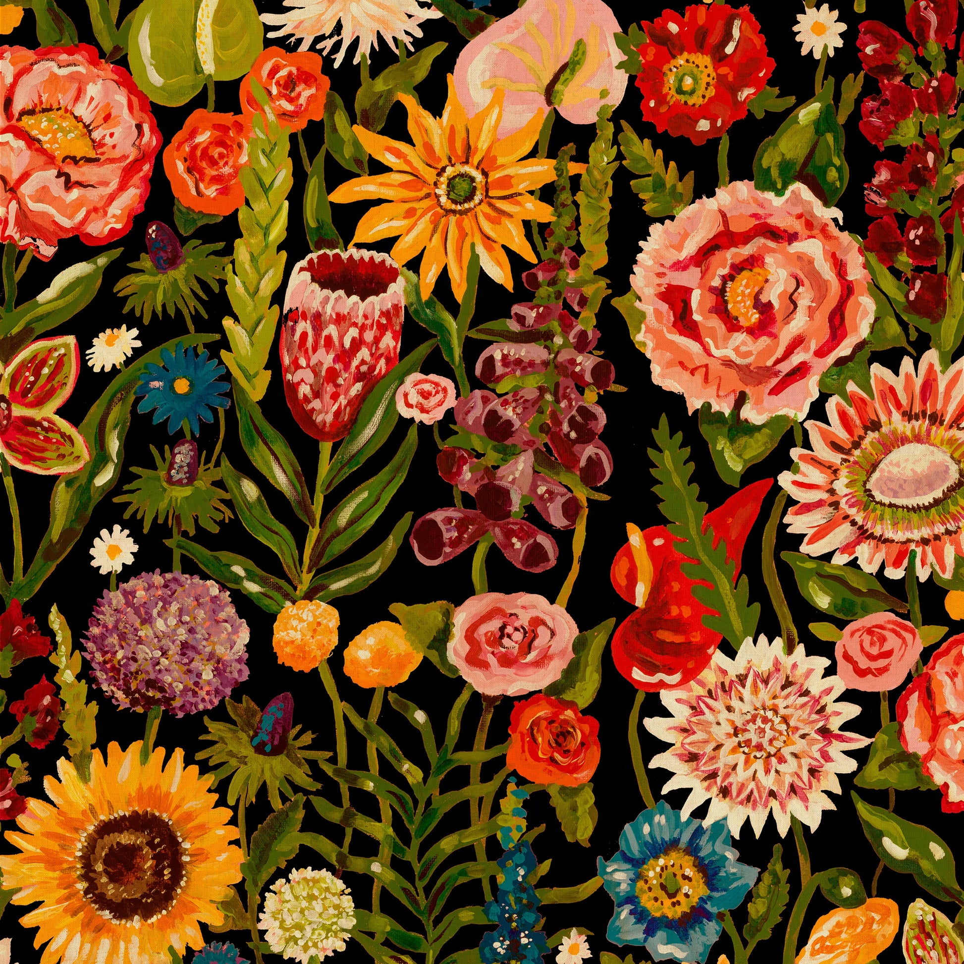 Our stunning print Utopia depicts a painterly meadow of gorgeous vibrant blooms. Titled 'Utopia' it evokes an imagined state in which everything is perfect. Featuring and entanglement of sunflowers, foxgloves, poppies, peonies and orchids!