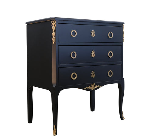 Louis XV Style Chest in Black with Fine Brass Fittings and a Marble Top