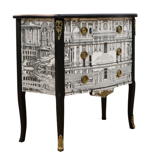 Louis XV Style Chest with Fornasetti Pattern of Ancient Rome and Black Marble Top
