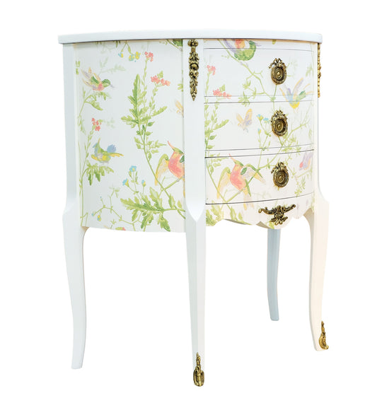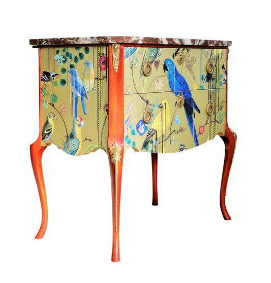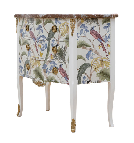 Louis XV style 3 drawer chest with exotic birds design and natural marble top