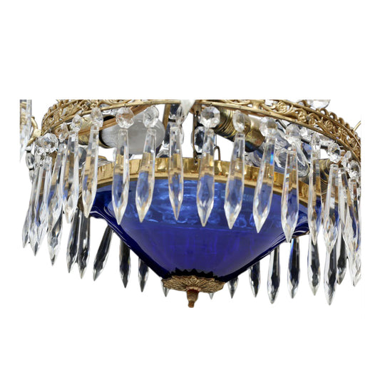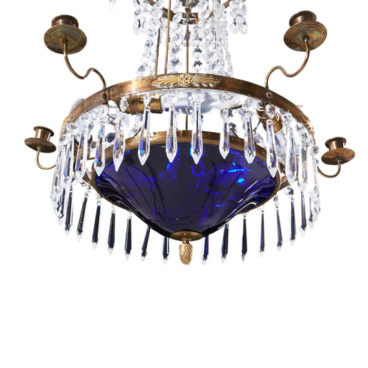 Antique 4 Arm Crystal Empire Chandelier with Blue glass bowl 1900's