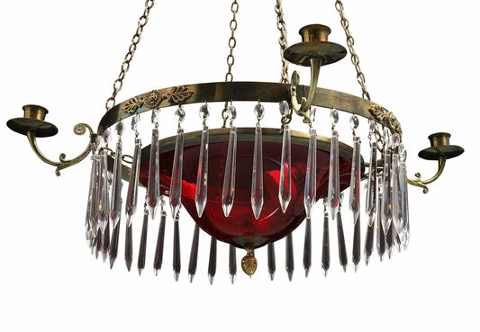 Antique 4 Arm Crystal Empire Chandelier with red glass bowl 1900's