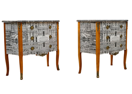 Pair of Louis XV Style Chest with Fornasetti Pattern of Ancient Rome and Grey Marble Top