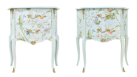 A Pair of Louis XV Style Bedside Tables with Floral Design and Marble Tops
