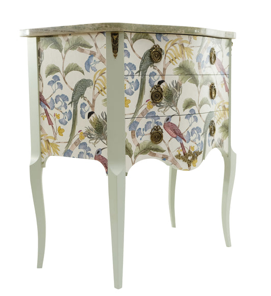 Gustavian Style Commode in Antique White with Exotic Birds Design and Marble Top