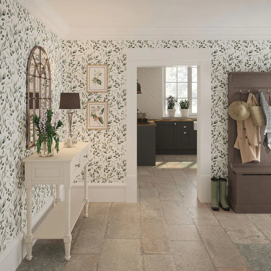 Countryside Trail Wallpaper - Rustic Greens on Ivory Linen