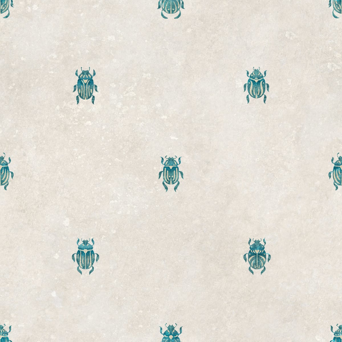 Stylized scarabs with decorative detailing in a row against a patinated background create a bold and chic atmosphere on the walls.