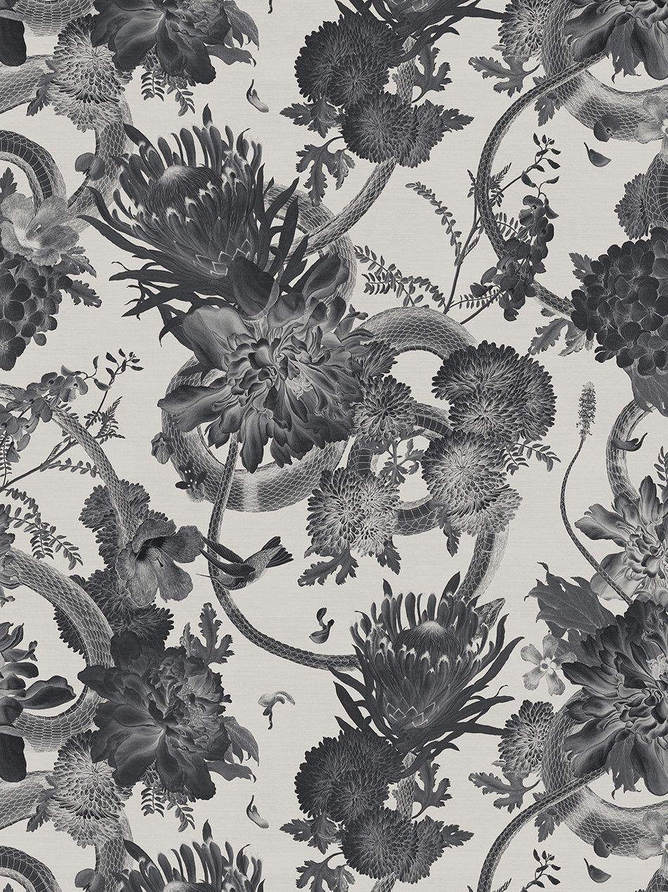Blending the botanical and reptile collections from The Natural History Museum, this recycled velvet features beautifully illustrated floral blooms mysteriously intertwined with sweeping serpents for a wild and untamed interior.