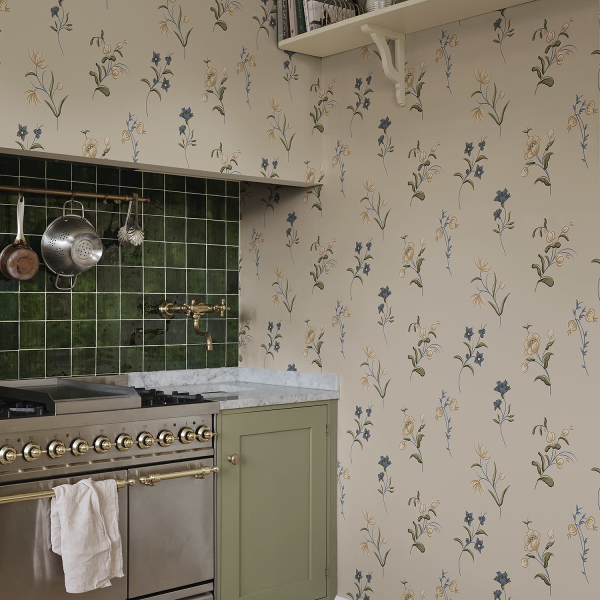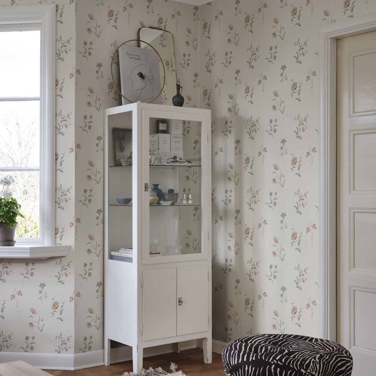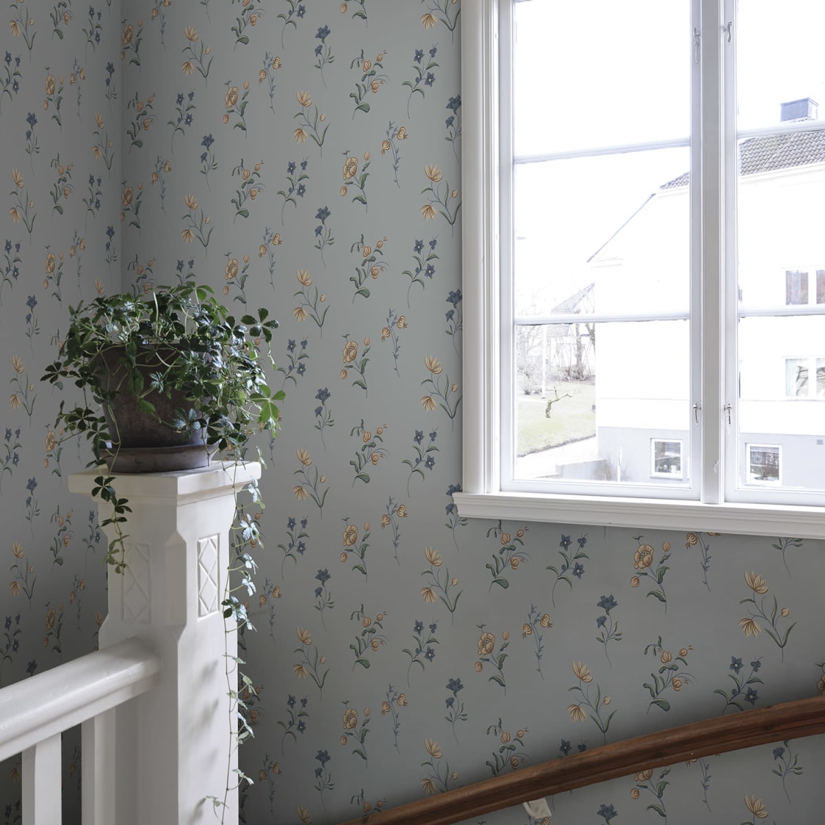 A patterned design slightly flirting with Swedish folk art and decorative painting from the 18th century. The bold brushstrokes and harmonious color scheme create an authentic feeling of hand-painted flowers on the wall.