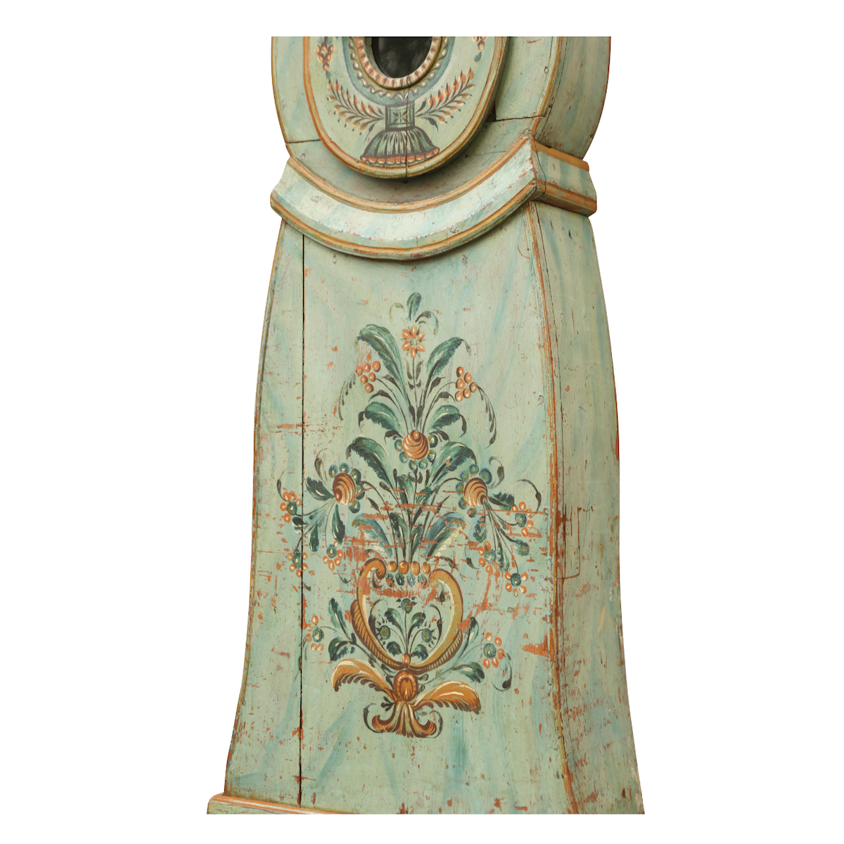 Antique Swedish Mora clock in green with hand painted floral details and clockmakers initials on face AAL and twon where the clock was made 'Mora'. Working Longcase clock mechanism of pendulum and 2 weights and a bell chime on the hour.
