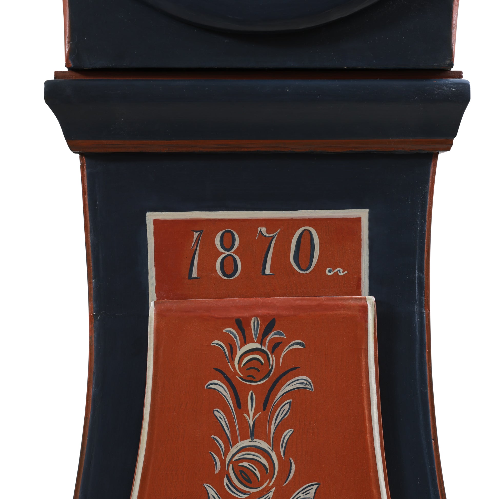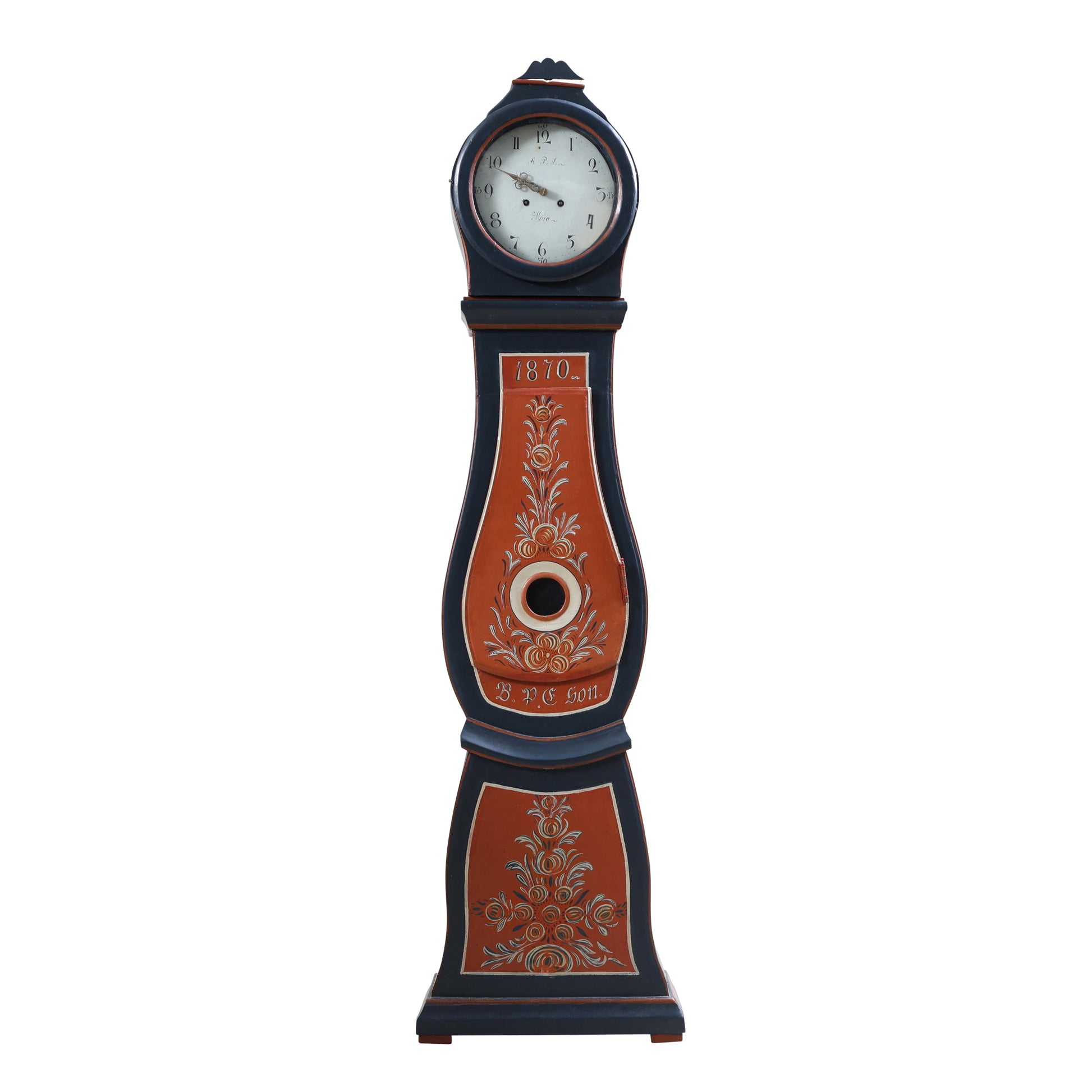 Swedish Mora clock dated 1870 with hand painted Swedish floral details. Inscription inside the clock and initial of clock maker: APL and vilage of Mora. Working Longcase clock mechanism of pendulum and 2 weights and a bell chime on the hour.