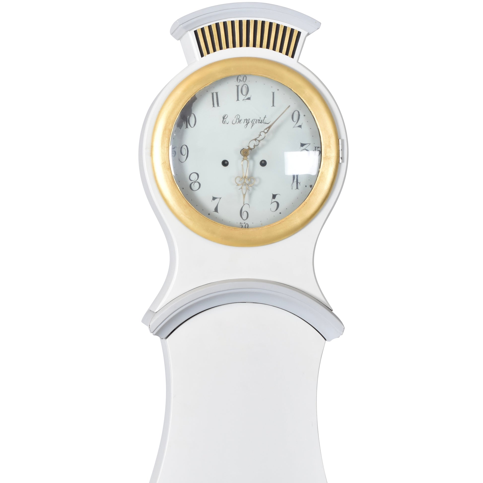 Swedish Mora clock from the 1800's with dial signed by E. Bergquist and inside the clock the date 1856 and village Aata. Working Longcase clock mechanism of pendulum and 2 weights and a bell chime on the hour.