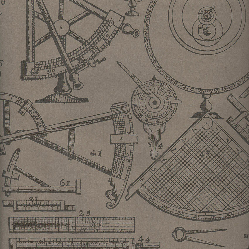 A wallpaper design featuring vintage diagrams of compasses, globes and protractors in muted coffee.