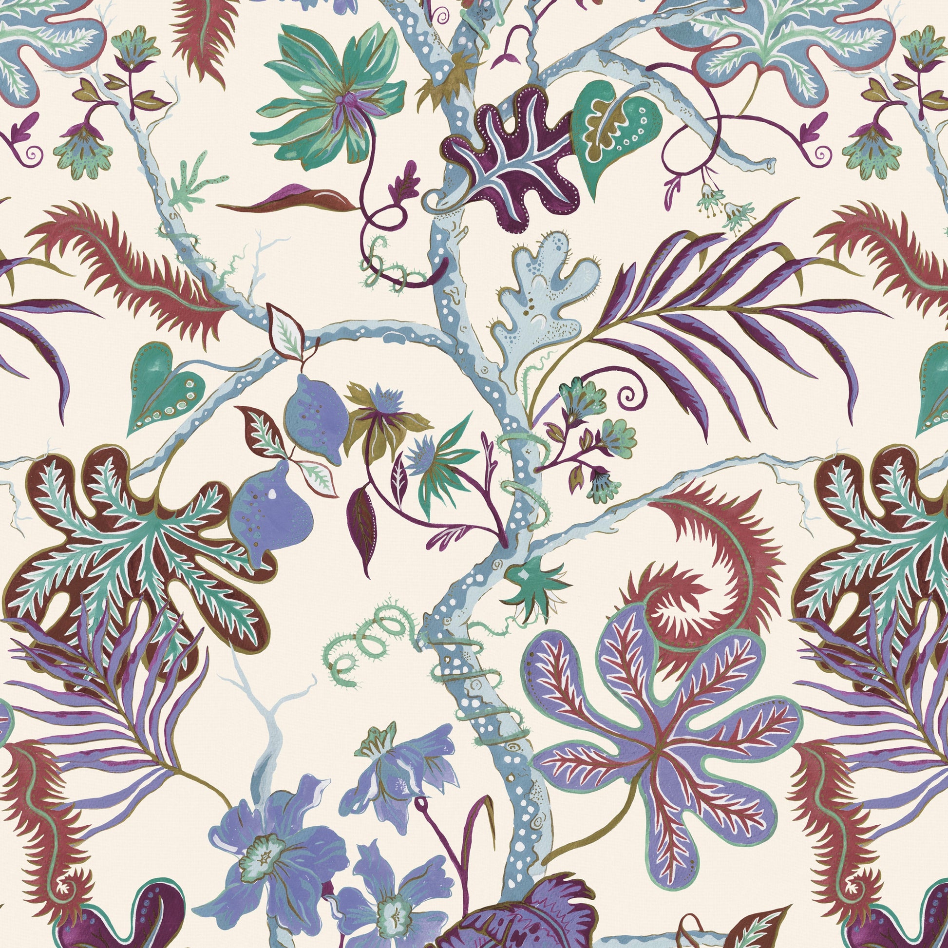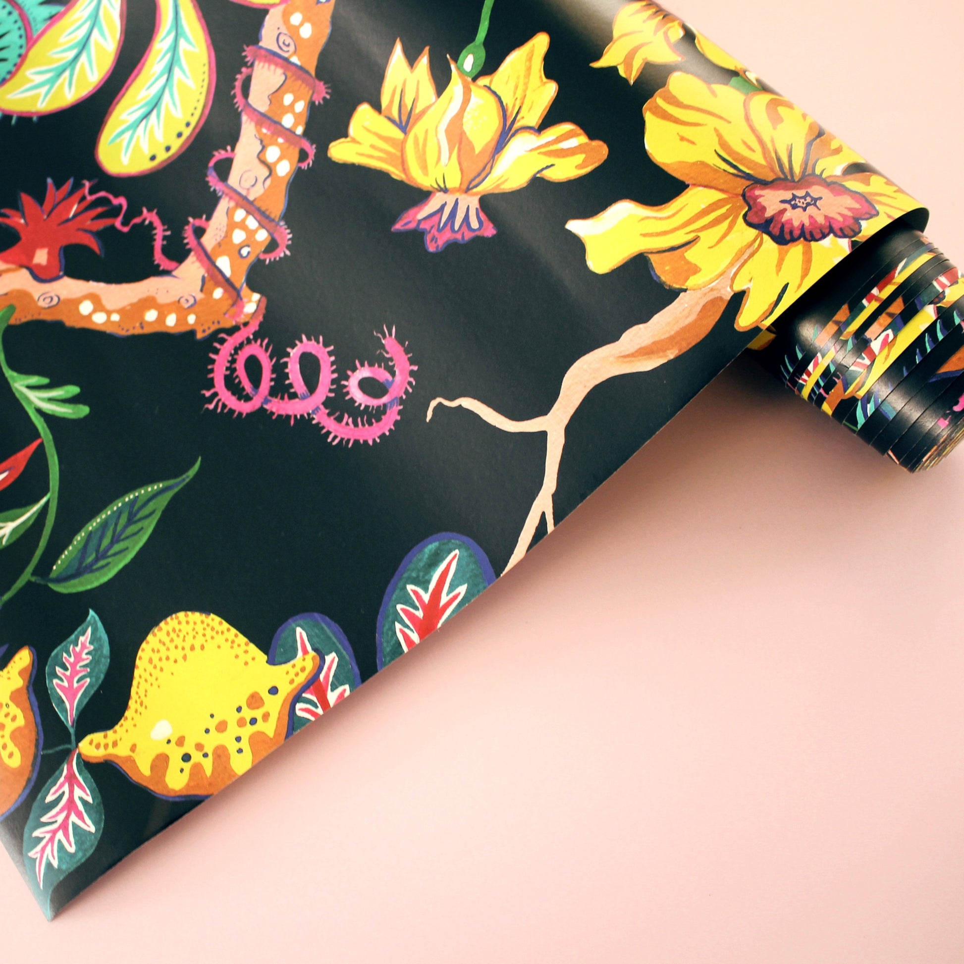 Our stunning print Ophelia presents a fantasy tree, portraying bold stylised florals, leafy palms, fresh fruits and reef corals all in a tropical colour palette. Ophelia will bring the sunshine to you - whatever the weather outside! Hand painted lovingly by us.
