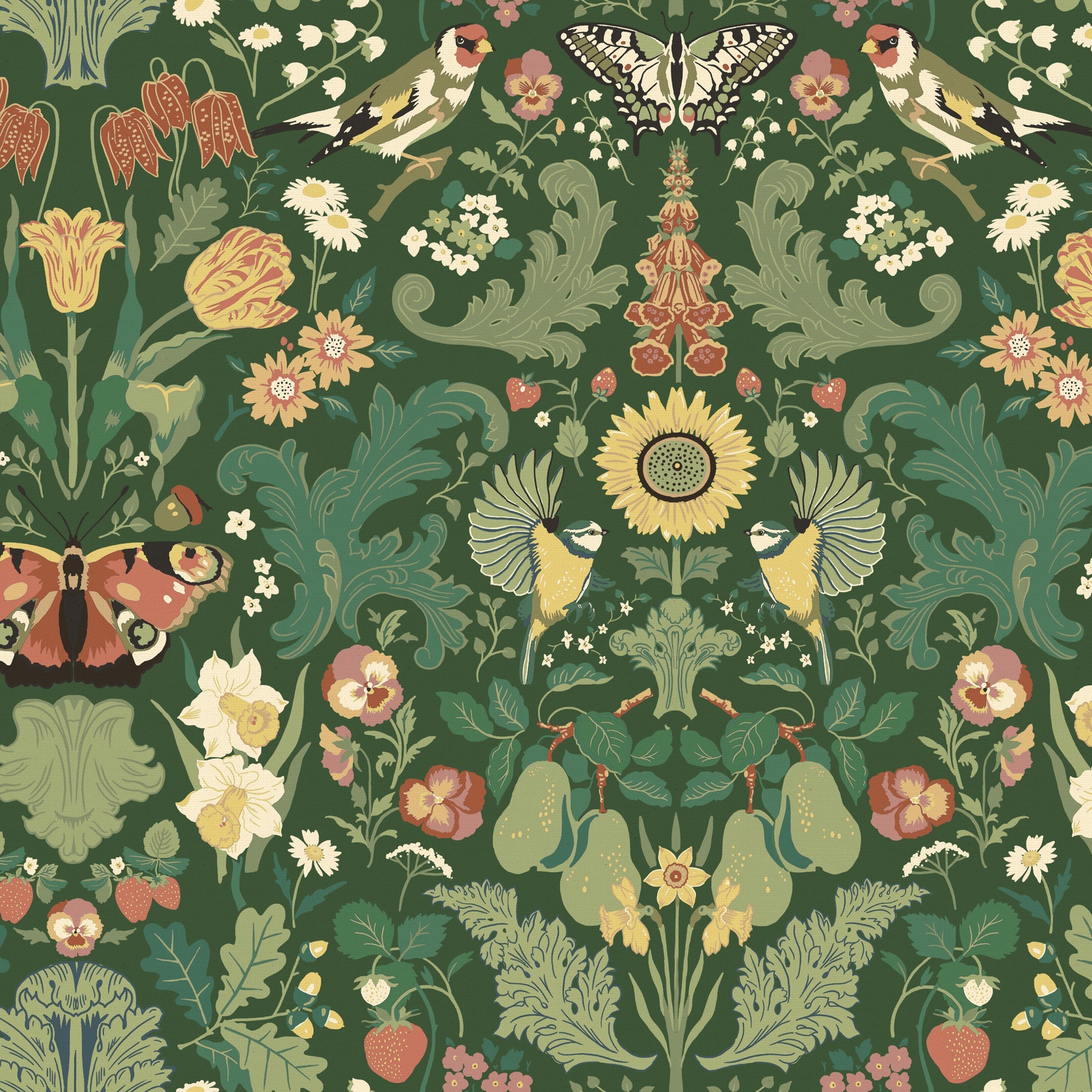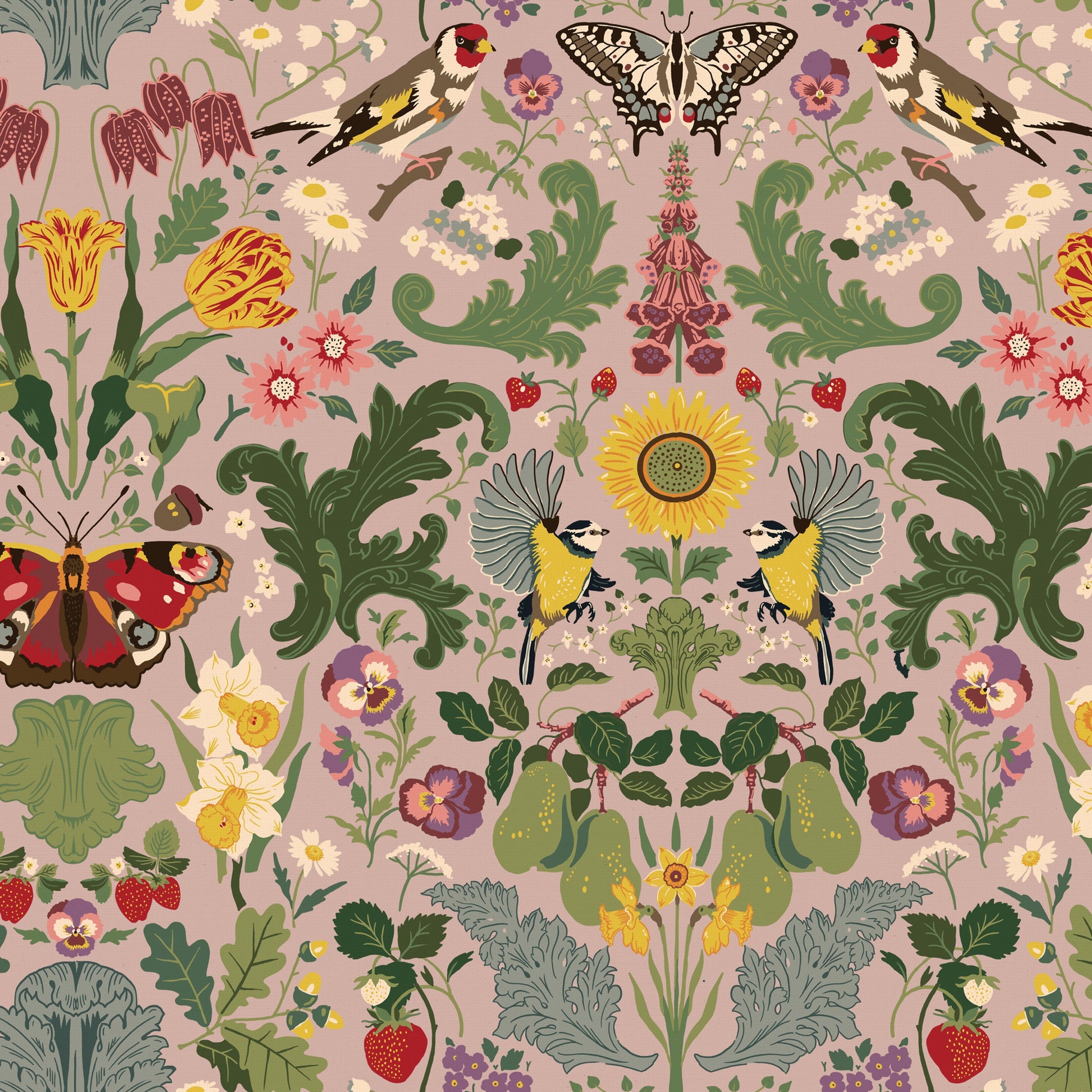 Admiral takes inspiration from the arts and crafts movement, a design of perfect symmetry echoing the beautiful admiral butterflies aesthetic. Set amongst British fruits such as the heritage pear and strawberry plants, flowers such as tulips and daffodils and native birds including the blue tit and the goldfinch all encapsulated in stunning stylized acanthus leaves. Admiral is a modern twist on traditional design. A homage to our favourite designer.