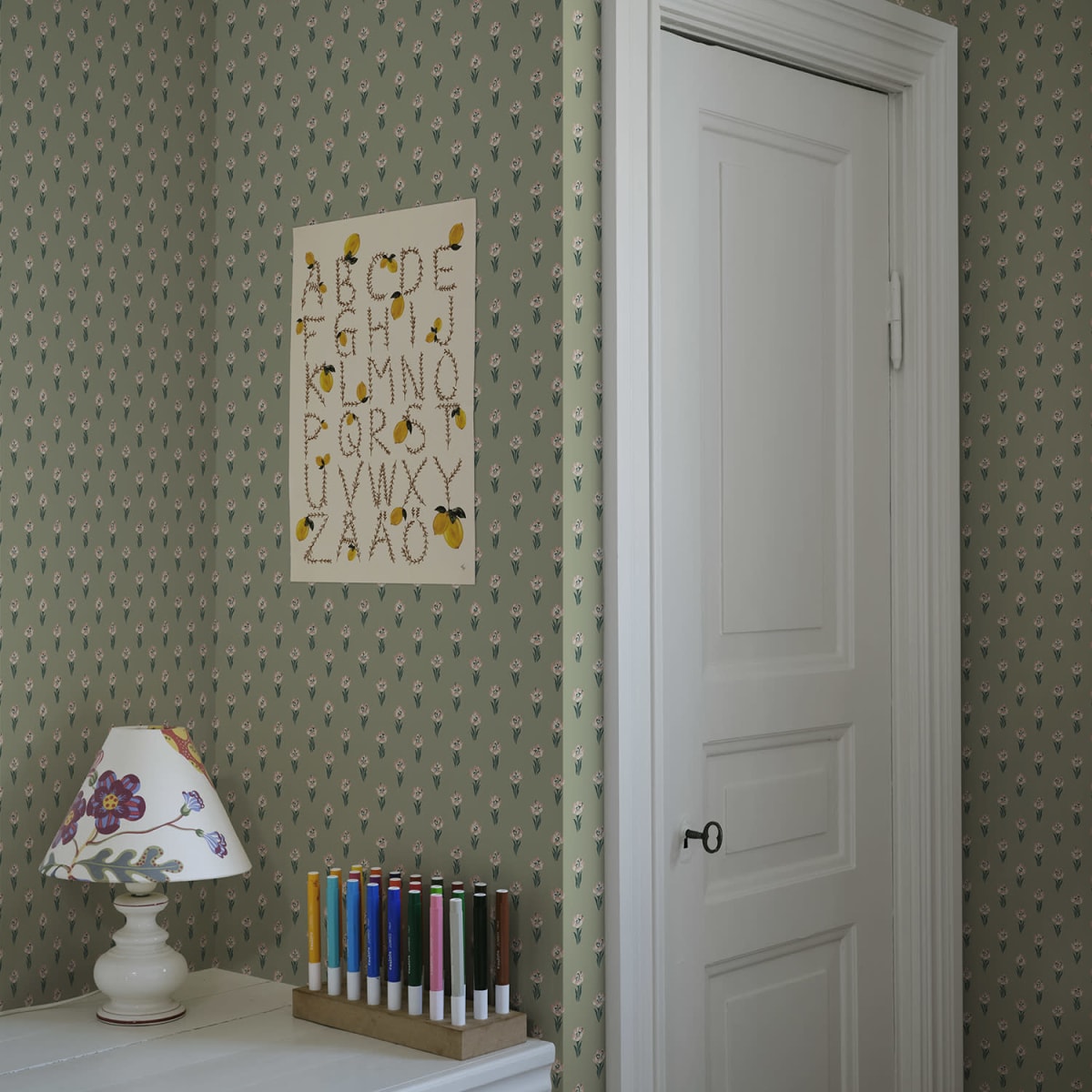 Eight tiny crocuses named "Timeless" are gathered in this decorative pattern, created in collaboration with Johanna Bradford. A detailed dotted pattern with a kind and cool international expression.