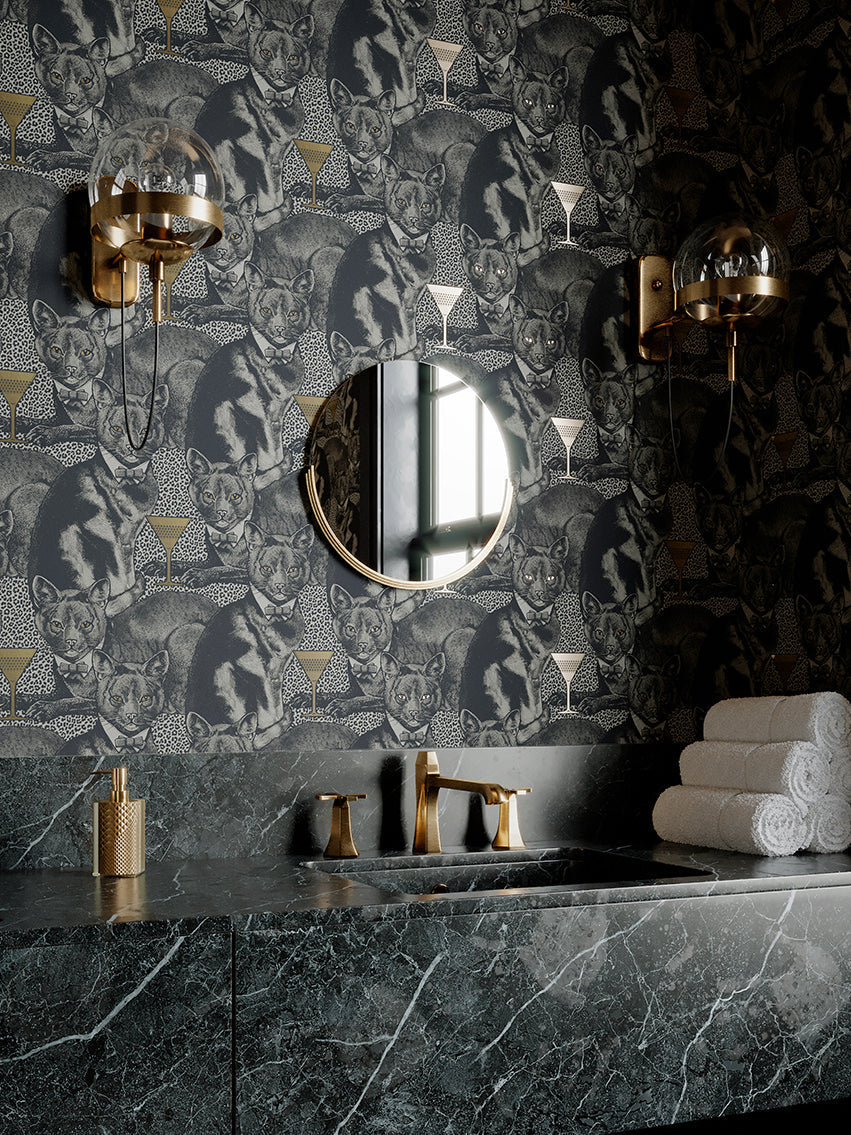 The ‘Cat-titude’ motif has been a key character within the wonderful world of Divine Savages since we launched. Fully embracing our love for witty maximalism, our Cat-titude wallpaper is at once unapologetically eccentric, and at the same time uniquely sophisticated.