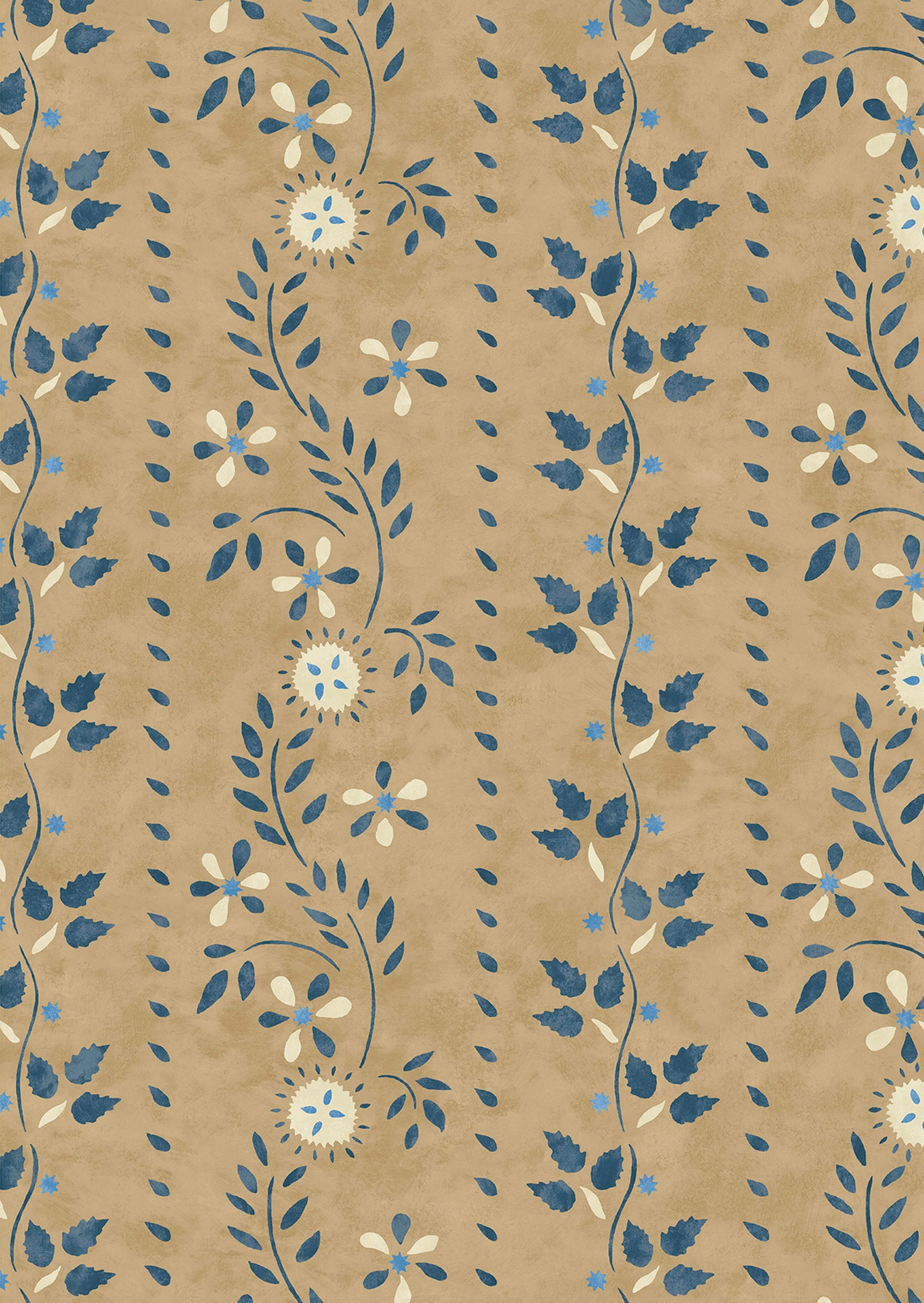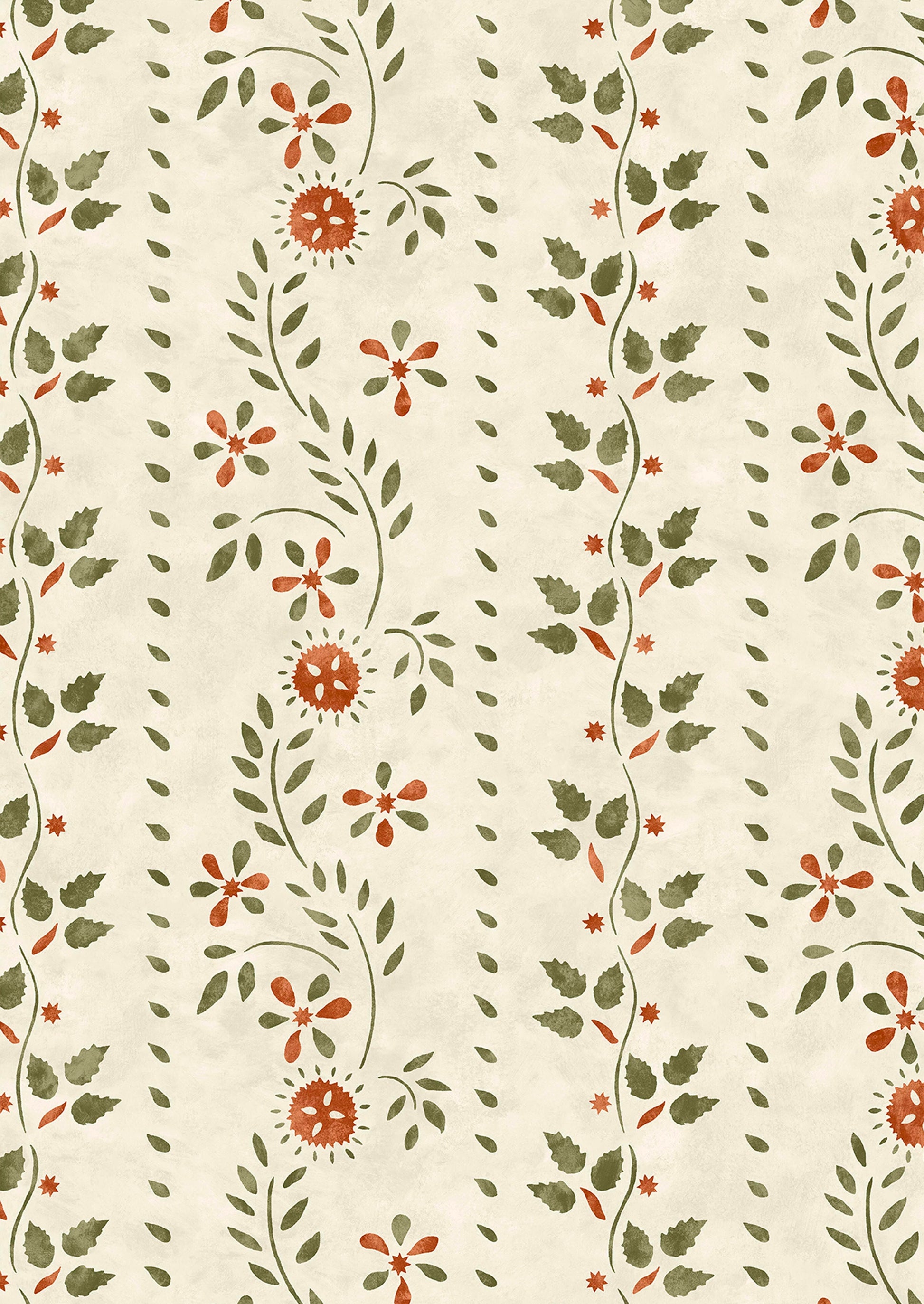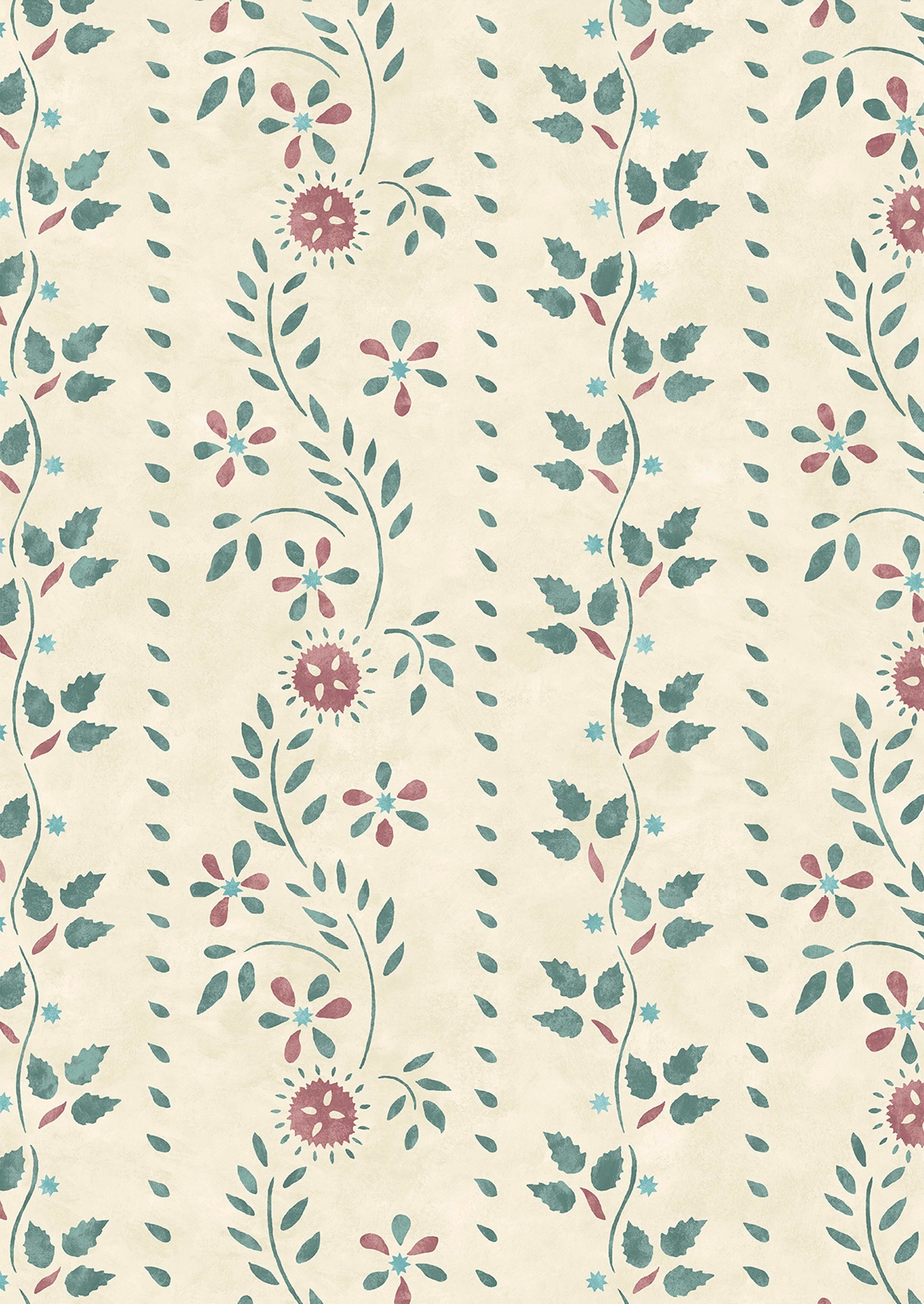 Based on a 19th century American stencil pattern now part of the collection in the American Museum in Bath. This antique wooden wall is believed to have been painted by master stenciller, Moses Eaton. Working from a photograph of the original we decided to replace one large leaf with individual strawberry leaves from Eaton’s archive.