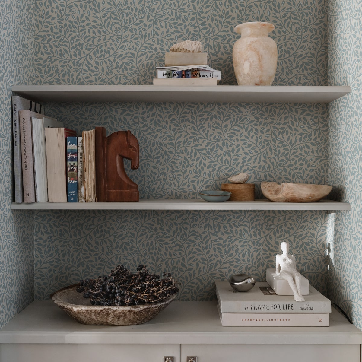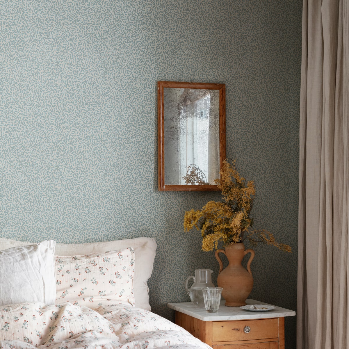 Wallpaper Sigfrid green is a dense leaf pattern which spreads across the wall and gives the room an harmonious look.