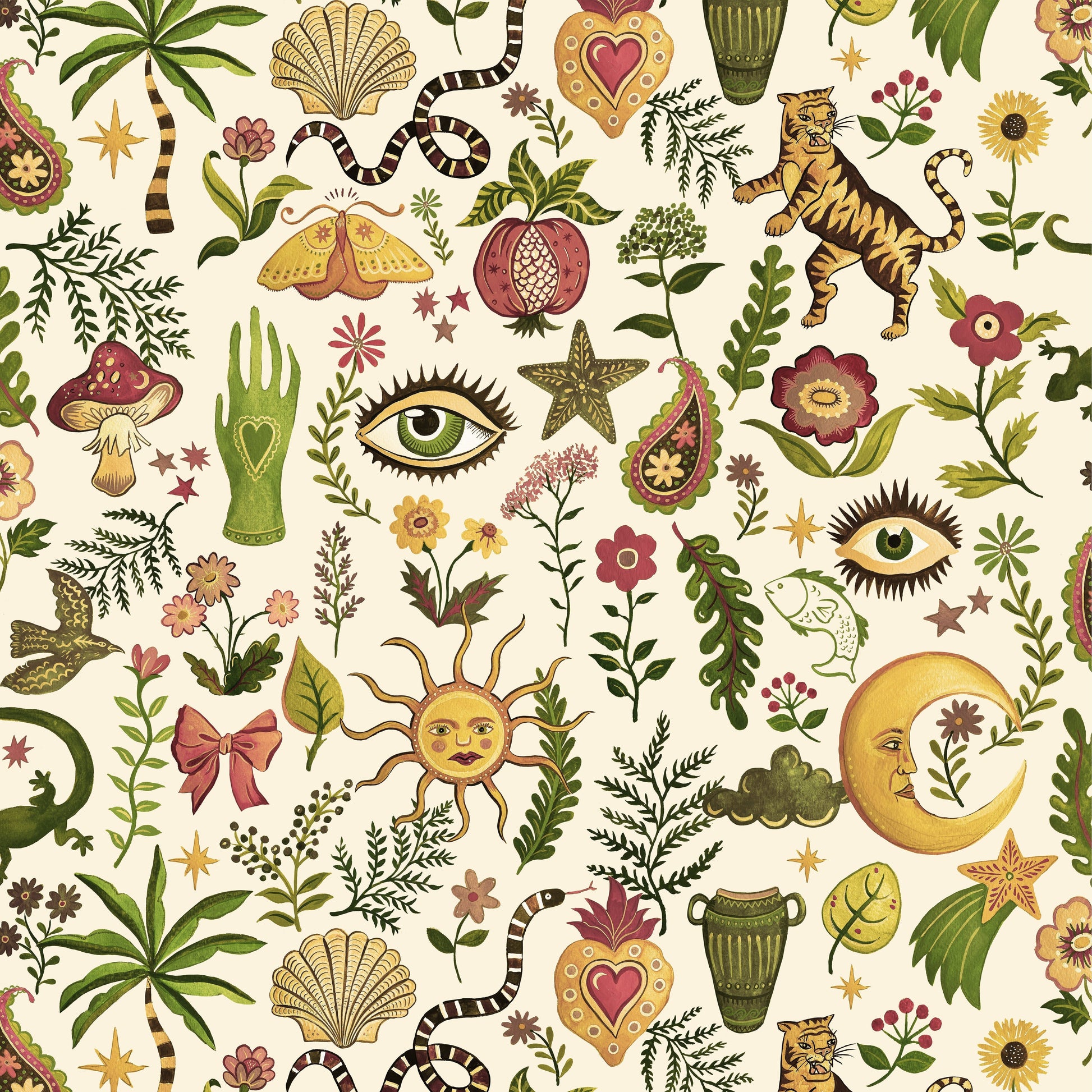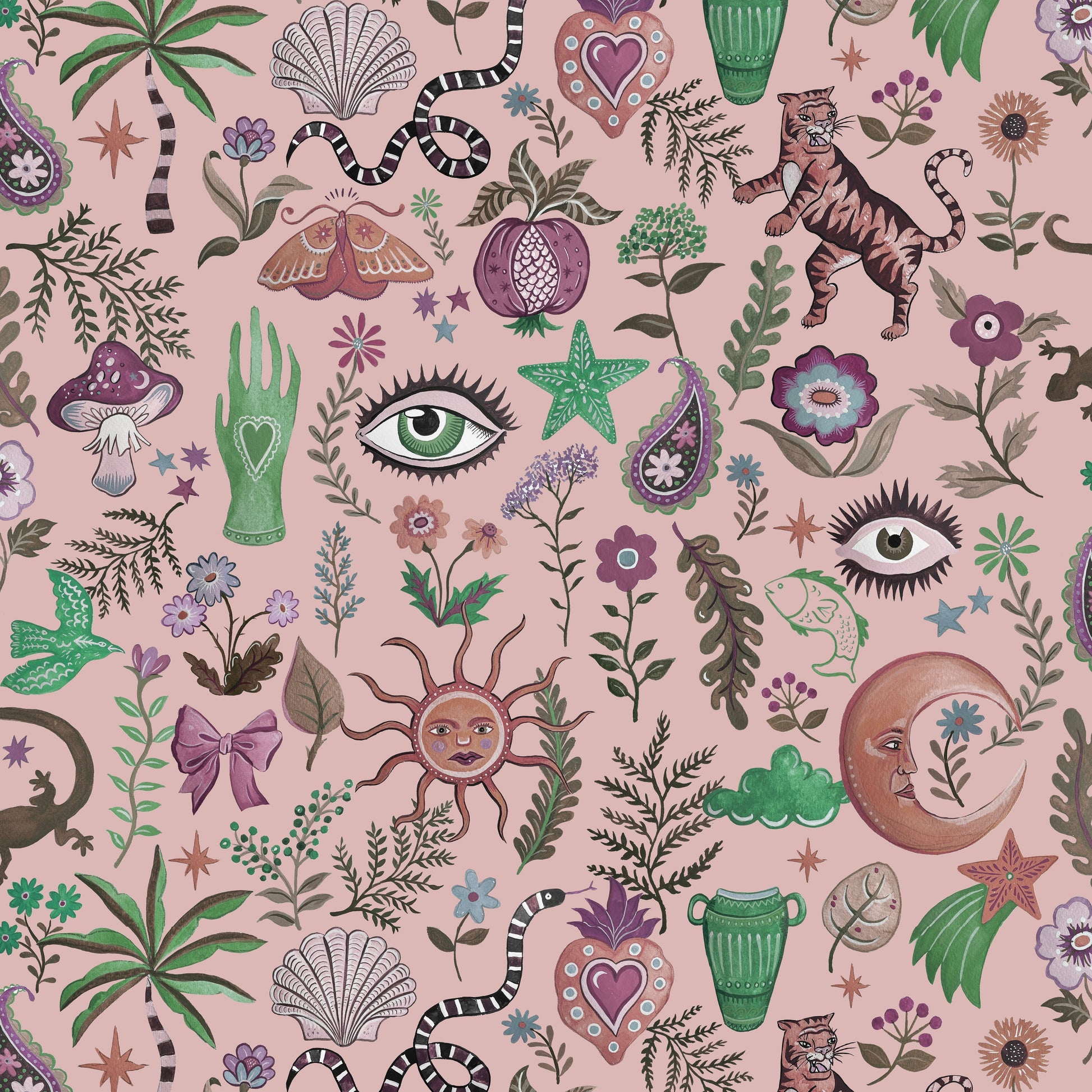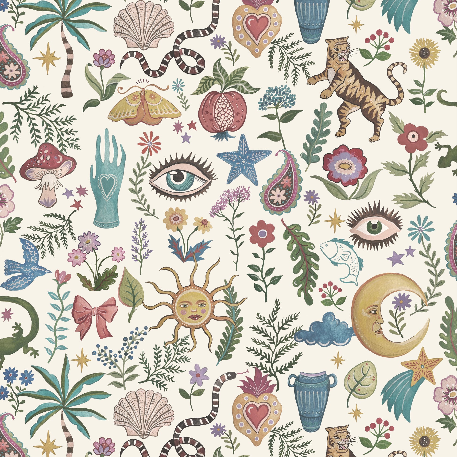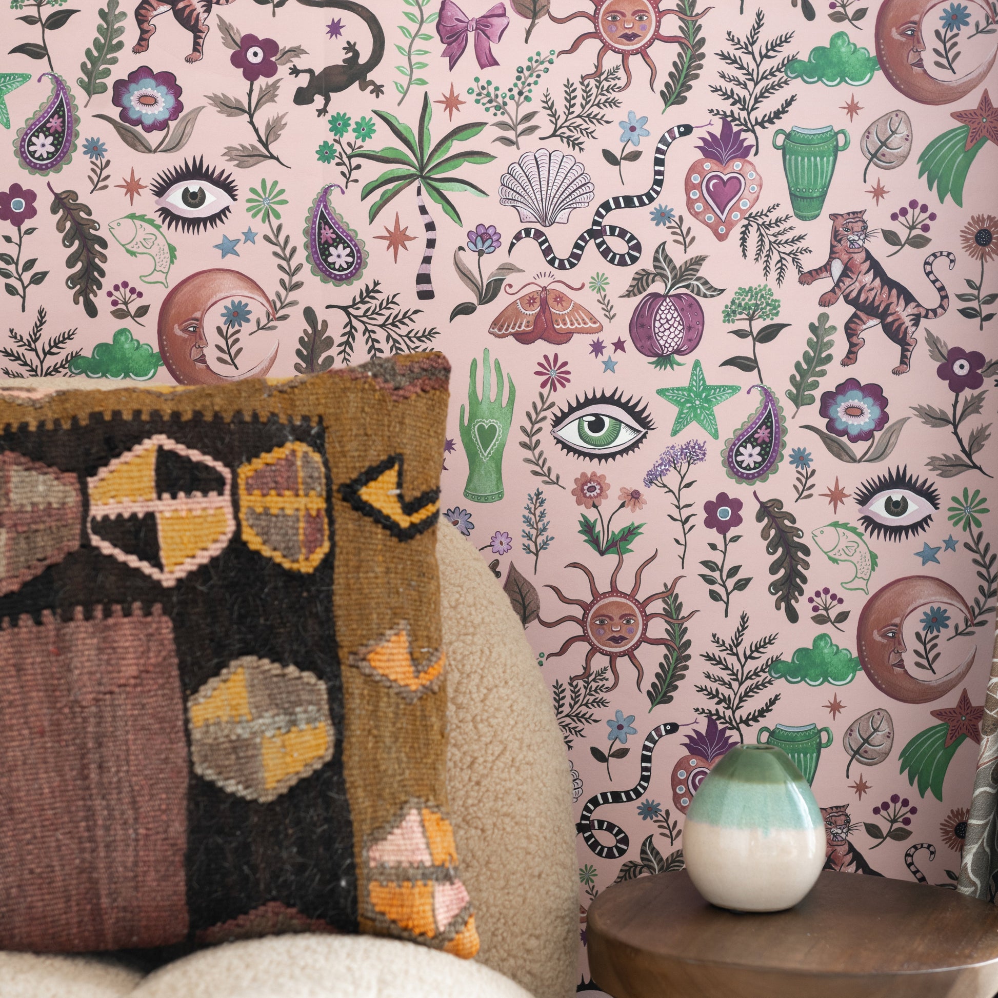 Our design 'Trove' is inspired by the treasure 'trove' of artisan goods found within the Medinas souks. Each symbol we've painted can be found as brass 'Talisman' wall hangings imbued with cultural and spiritual meanings. They are designed to be hung above your front door to ward off evil and negative energys and act as a spiritual safegaurd to the household. Other symbols are used to attract blessings, peace and good fortune.