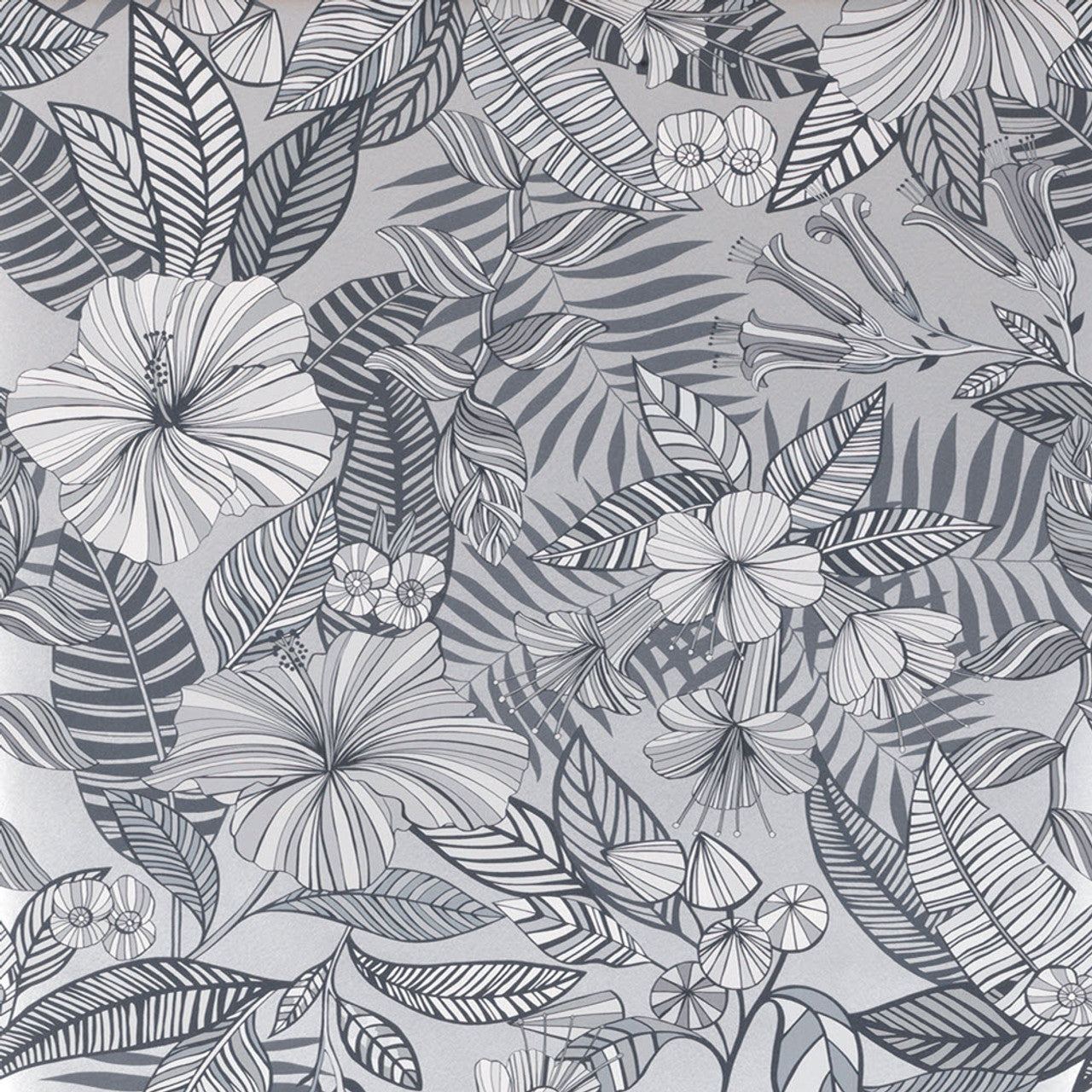 An all-over stylised composition of colourful flowers and contrasting striped leaves.